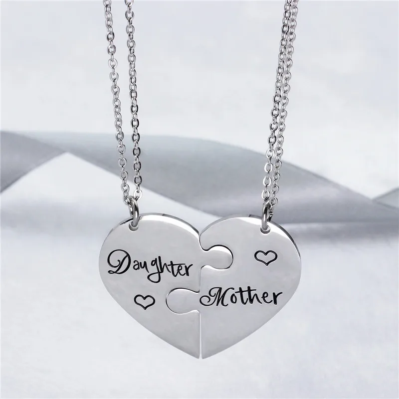 2 Pcs/Set Father Daughter Mother Son Necklace Stainless Steel Heart Puzzle Pendant Necklace Family Jewelry
