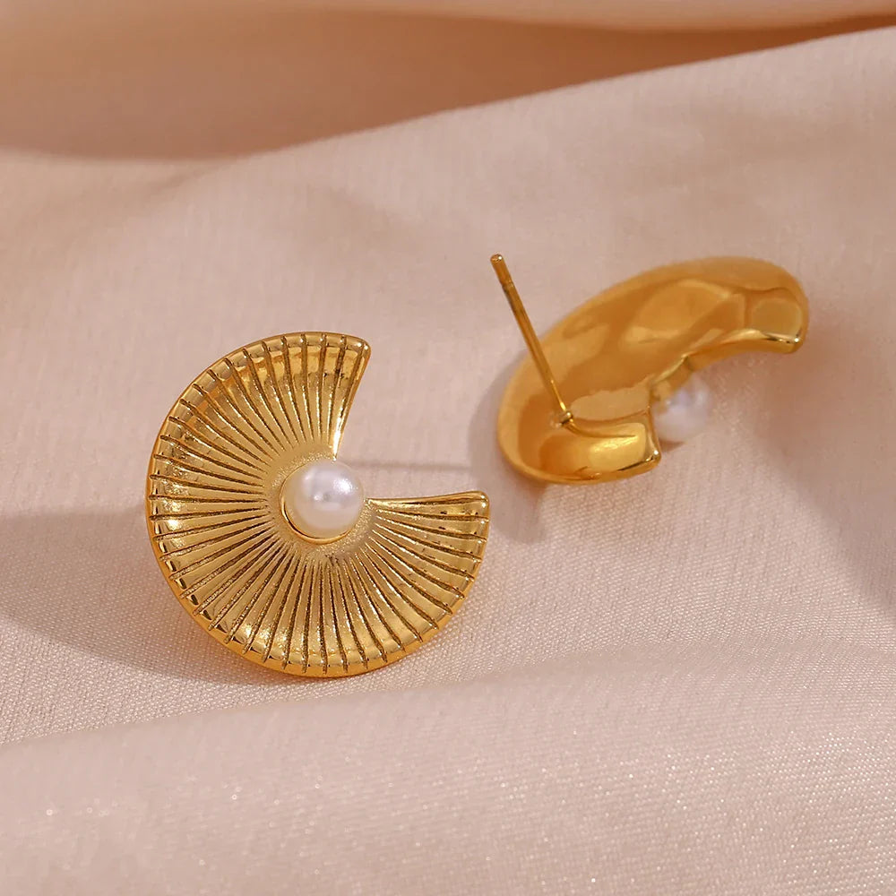 Brincos de Pérola com Design de Leque Dourado